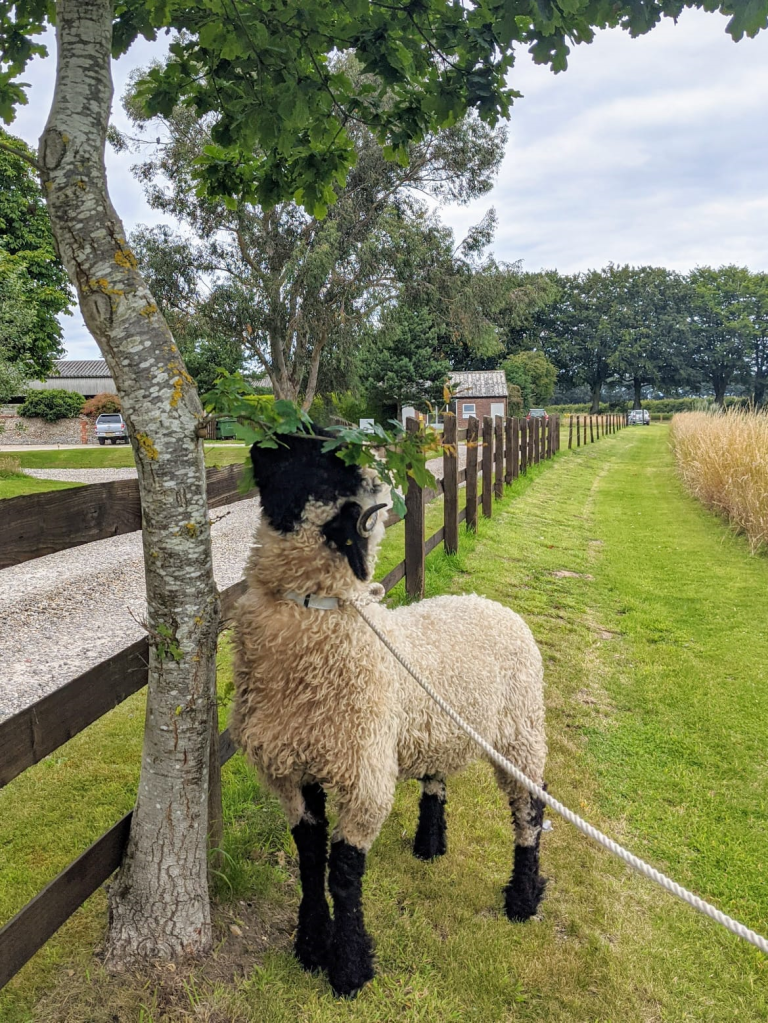 So, this was it really, make or break my fledgling sheep walking enterprise. I got there early, got Georgie on a lead and walked her about a bit first, saw the family coming towards me in a very calm manner, children calm, Georgie calm, this was going to be just fine so off we went!